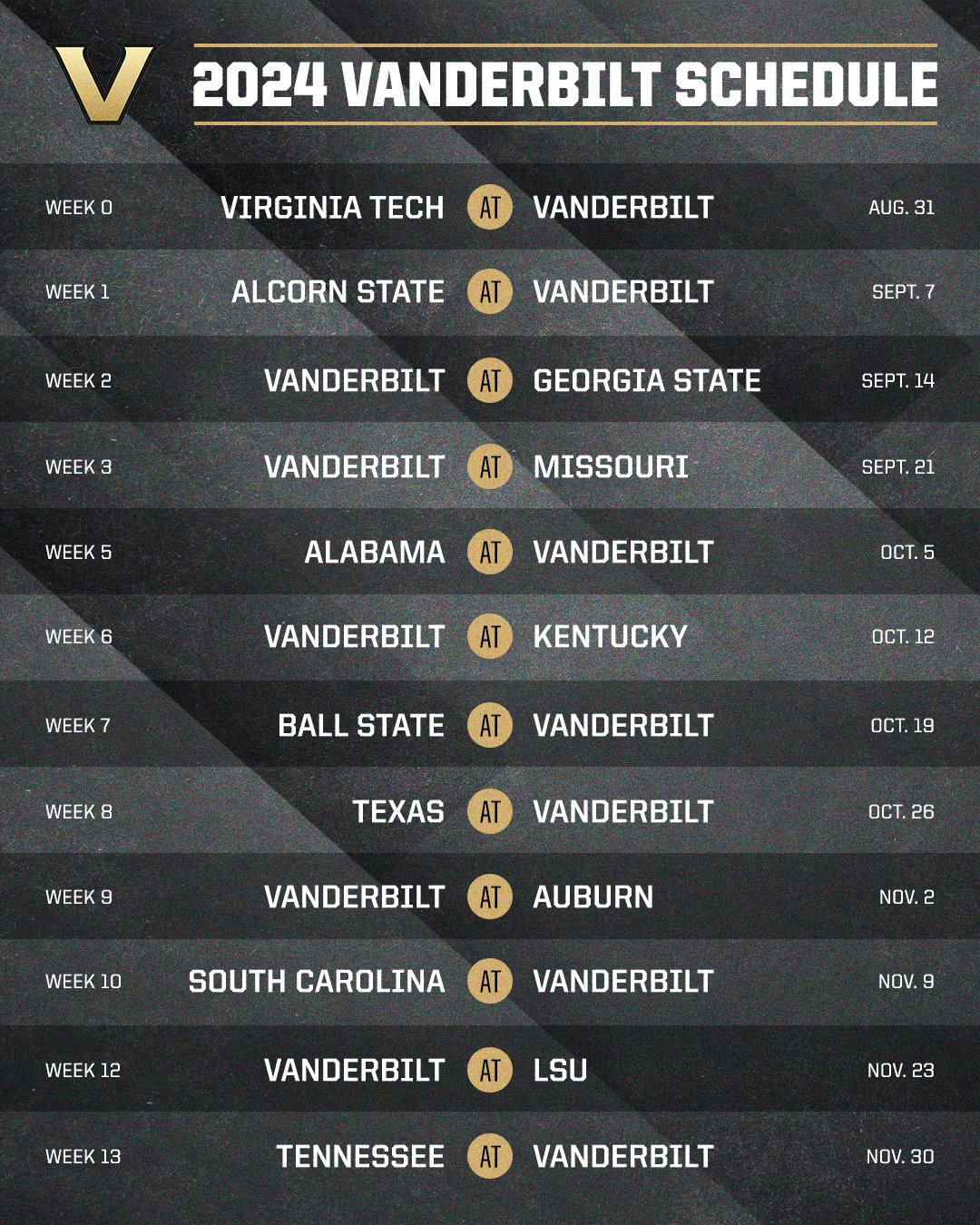 Vanderbilt Football Schedule 2024 23 – The SEC is rolling out a new scheduling model in 2024. How has Auburn historically fared against opponents on its schedule? . Is it possible there is more optimism for Kentucky’s 2024 football prospects among national pundits than within the commonwealth? Earlier this month, ESPN.com’s Mark Schlabach ranked UK No. 23 in the .